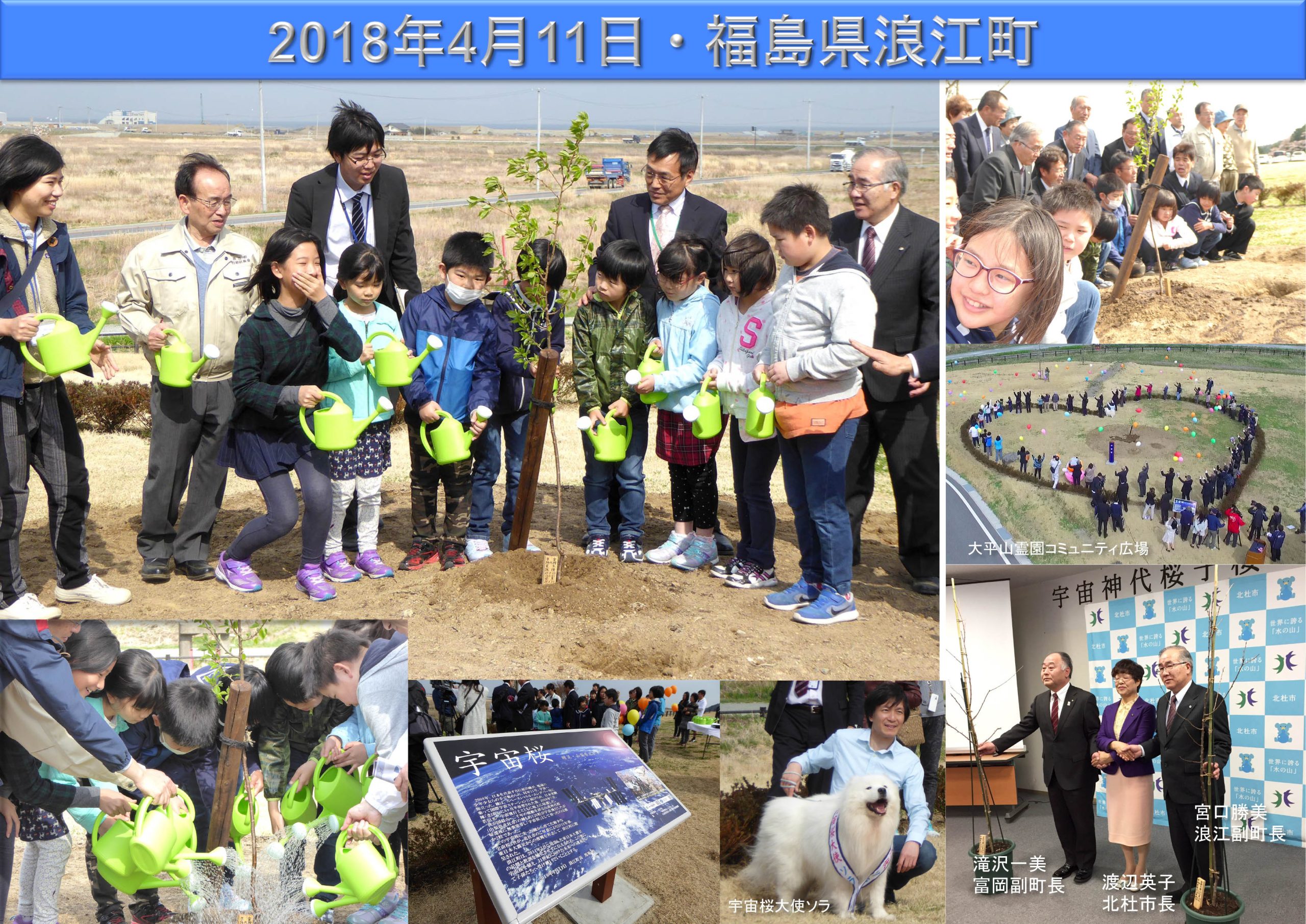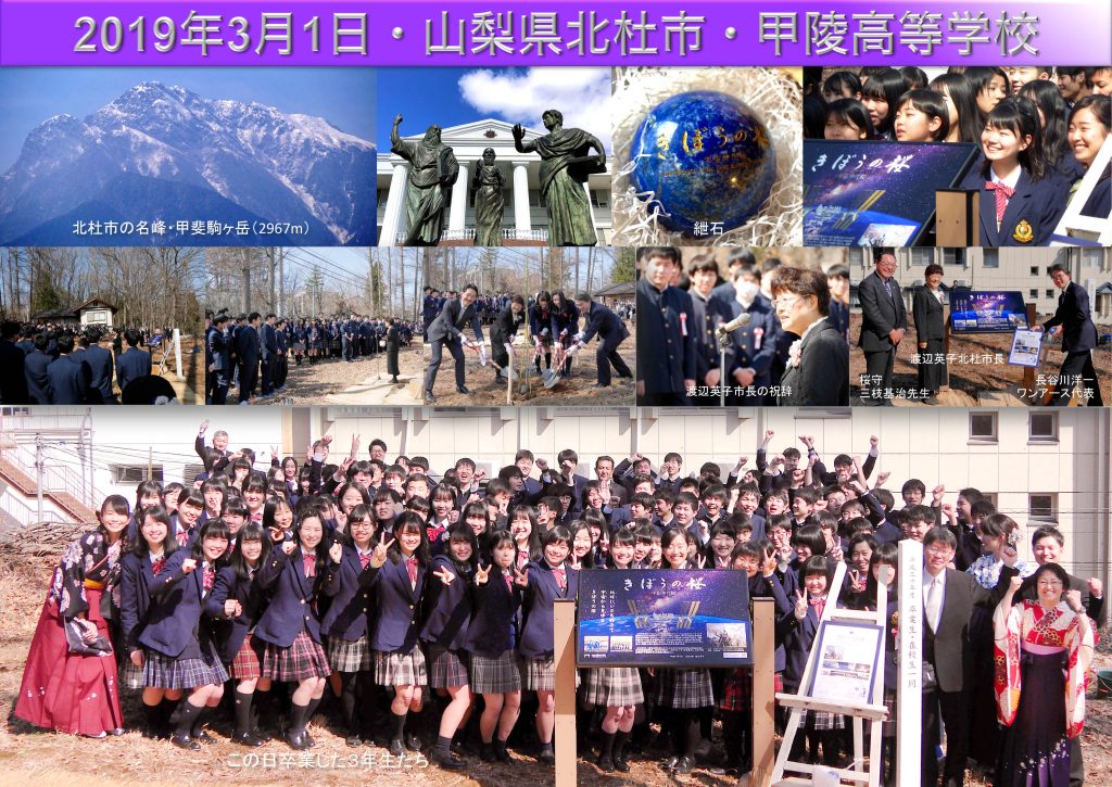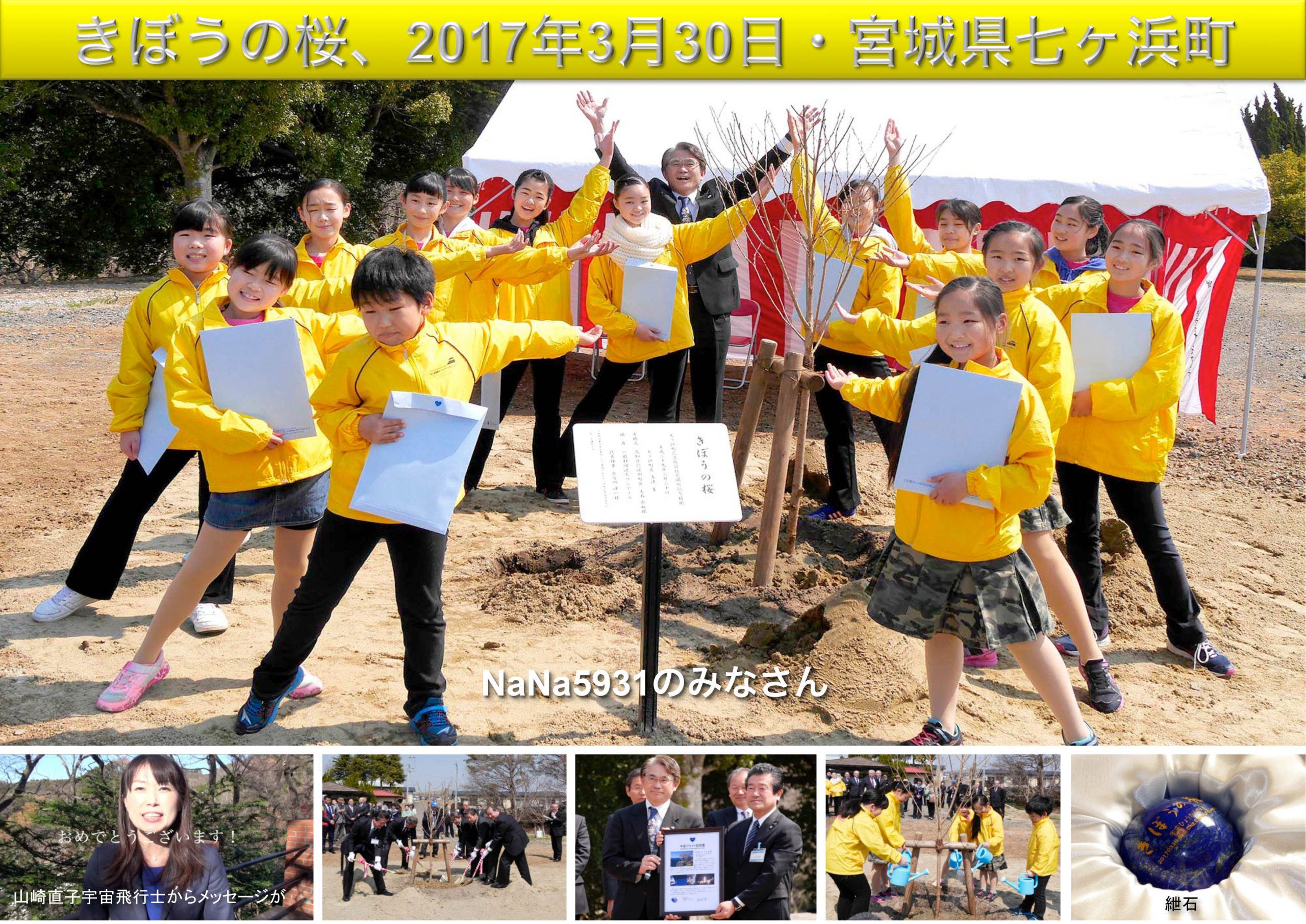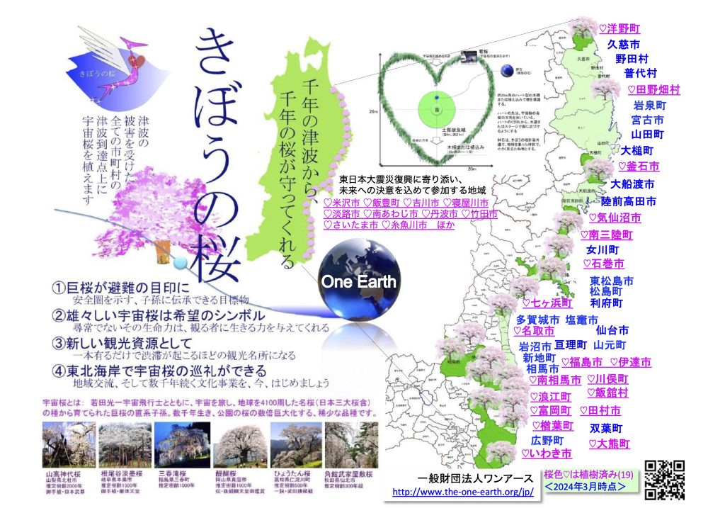 若田光一宇宙飛行士とともにその種が宇宙を旅した日本各地の巨大桜の直系子孫(宇宙桜)を、津波到達点上に植え、千年風化しない避難の目印として、そして宇宙からも見える復興のシンボルとして、この星の子孫たちに残します。